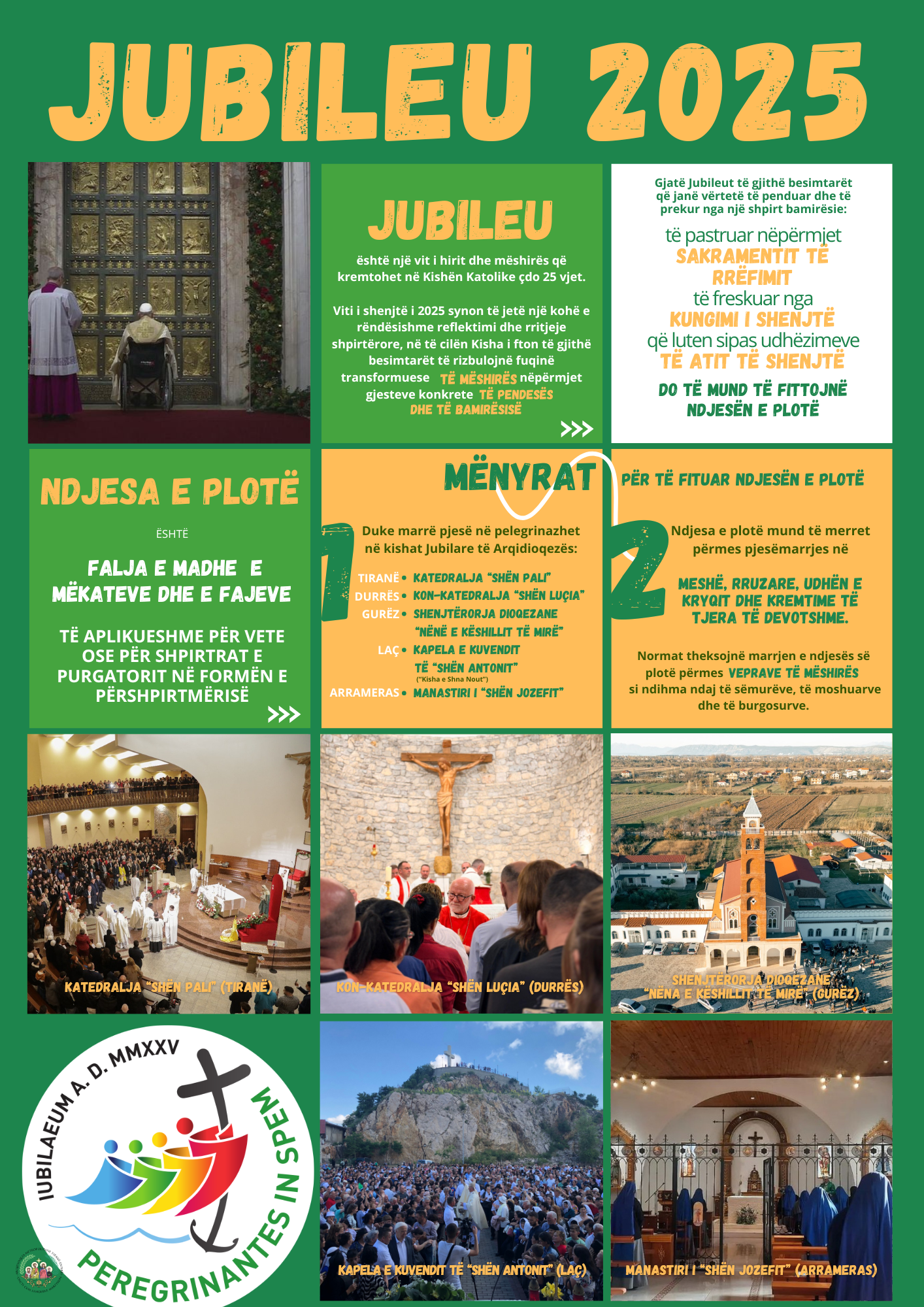 Të dielën, më 29 dhjetor 2024, Festa e Familjes së Shenjtë, Dioqeza e Tiranë-Durrësit do të inaugurojë Jubileun në nivel lokal duke hapur Kishën e parë jubiliare, Katedralen “Shën Pali” në Tiranë. Procesioni do të nisë pranë statujës së Papa Françeskut, përpara Katedrales, në orën 9:15. Pas rënies së Kampanës së Paqes, procesioni do të vijojë drejt Kishës Katedrale. Kishat ku mund të fitohet indulgjenca jubiliare janë: Kon-Katedralja “Shën Luçia” (Durrës), Shenjtërorja Dioqezane “Nëna e Këshillit të Mirë” (Gurëz), Kapela e Kuvendit “Shën Antoni” (Laç Kurbin), Manastiri i “Shën Jozefit” (Arrameras). Një kalendar i pasur aktivitetesh dioqezane dhe kombëtare do të shoqërojë të gjitha grupet e besimtarëve dhe njerëzit e vullnetit të mirë për t’u afruar me hirin e Zotit gjatë këtij Viti të Shenjtë të Shpresës.